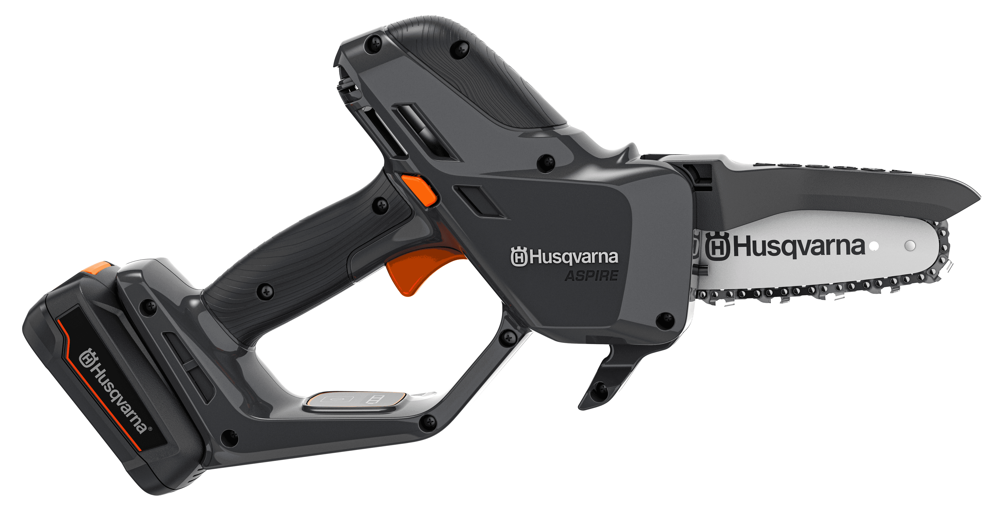Compact handheld battery pruning saw, perfect for pruning trees, cutting down garden waste and smaller carpentry work. Built on our proven chainsaw expertise, this all-round mini pruning chainsaw is robust enough to easily cut branches 75mm wide. Equipped with an easy and tool free replacement of chain and bar and improved safety with an anti-slip handle and automatic shutdown when left unattended. Storage is made easy with the included hook and part of the 18V POWER FOR ALL battery system. The Husqvarna Aspire battery powered tools has been developed with limited space in mind. This is why every product comes with a tailor made storage hook which can be mounted directly on the wall or used with the Husqvarna Aspire Storage Rail system. This tool storage can be extended with all gardening tools alongside the Aspire rail system. This product is part of the POWER FOR ALL ALLIANCE and compatible with numerous other batteries and chargers from participating brands. This means that you only need to buy one battery for all your home and garden products.